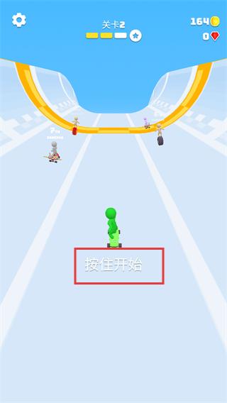1、游戏开始时出现按住开始提示,进入关卡2赛道,与其他角色一同准备开启趣味竞技的独轮闯关之旅。