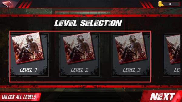 1、进入关卡选择界面,可选择LEVEL1、LEVEL2、LEVEL3等关卡,开启末日僵尸射击生存挑战,在不同关卡中对抗多样僵尸,开启你的射击之旅。