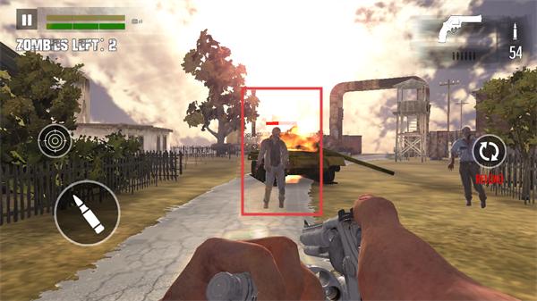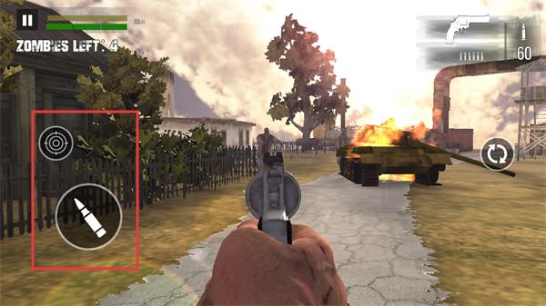 2、在游戏中利用左侧瞄准和子弹按钮,配合枪械射击僵尸,关注剩余僵尸数量,在有坦克的场景中灵活操作,提升射击生存技巧。