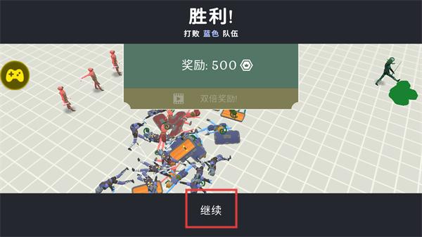 4、击败敌方队伍后弹出胜利界面,显示奖励500金币等信息,点击继续可开启下一场对战,继续探索策略玩法。