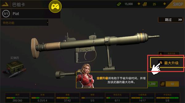 2、针对巴祖卡火箭筒,点击最大升级按钮,助力节省升级时间,增加武器最大功率,强化海滩防御的重火力打击能力。