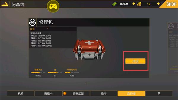 3、在支援者界面找到修理包,点击升级按钮,提升修理包的修复效果,为海滩作战时的生存提供坚实后勤保障。