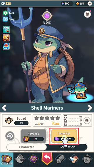 4、在角色详情页可点击Level Up按钮,消耗资源提升动物战士等级,增强队伍战力,助力奇幻冒险。