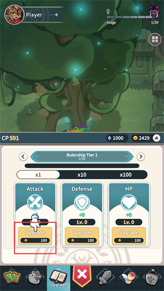 1、在升级界面可选择Attack选项,消耗资源点击Upgrade提升攻击属性,同时也可升级防御、HP,增强队伍战力,为抵御敌对势力入侵做好准备。