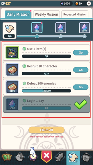 4、在日常任务界面,完成使用物品、招募角色、击败300敌人、登录等任务,可领取资源奖励,配合挂机系统积累离线收益,不断推进冒险进程。