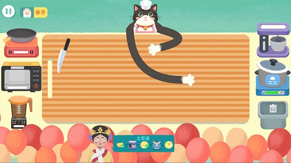 2、滑动猫咪手臂,点击屏幕抓取菜刀,移至食材上进行切割。