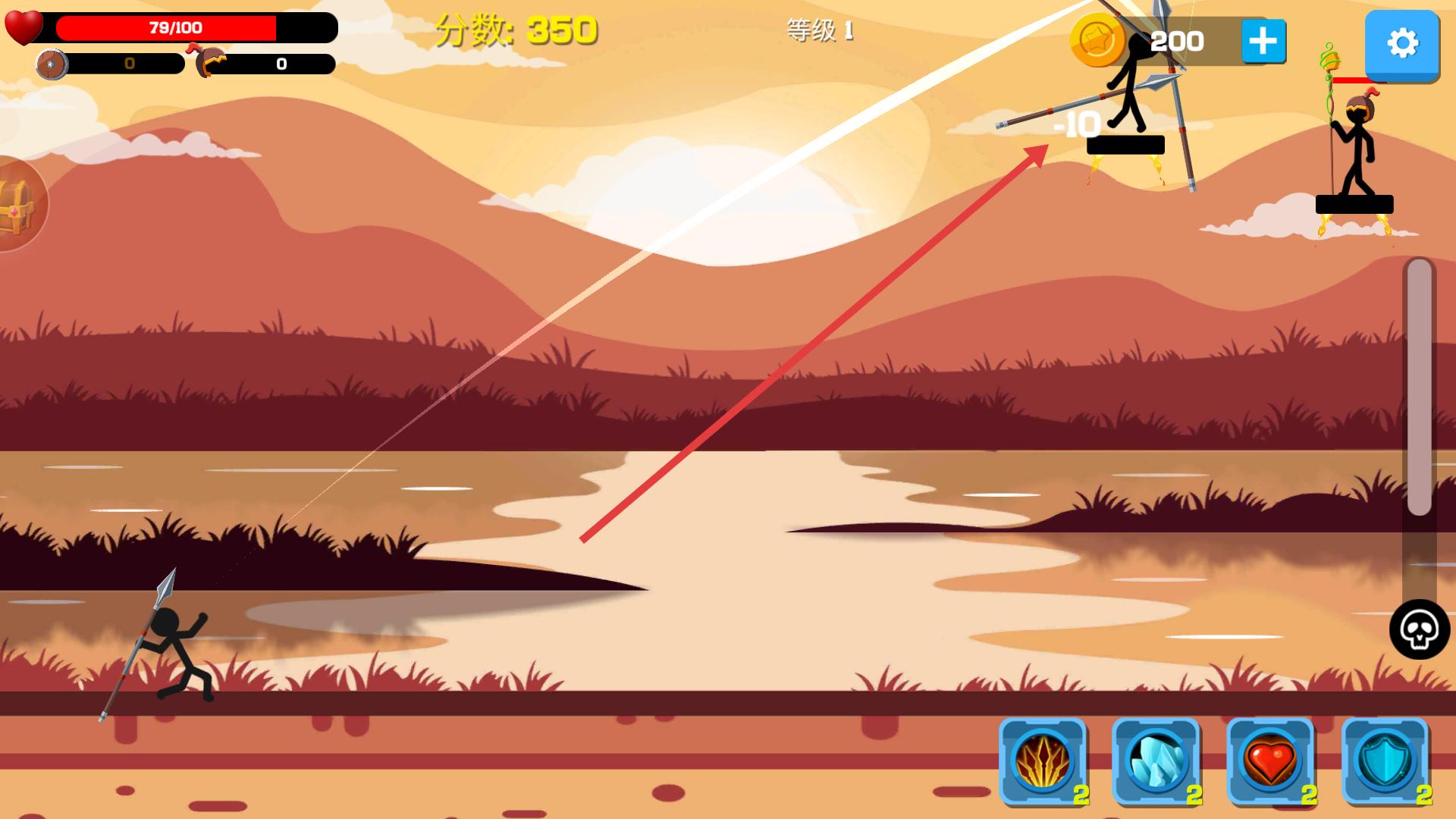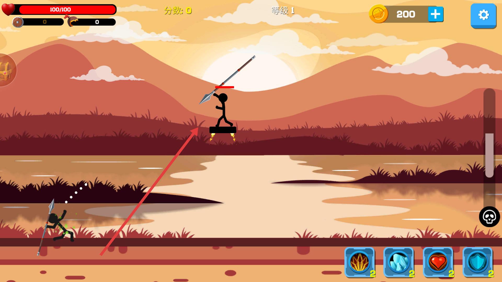 2、在战斗页面瞄准空中持矛的火柴人敌人,调整射击角度,发射武器发起攻击。