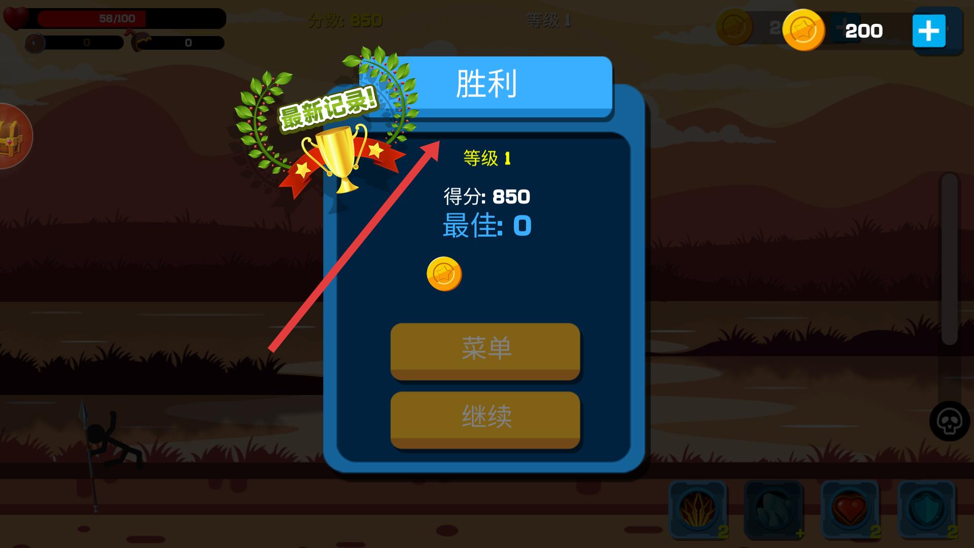 4、战斗胜利后进入胜利页面,查看得分和获得的金币,可选择菜单返回主界面或继续挑战下一级,完成一局游戏的流程。