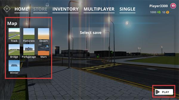 2、选择Track、FlatGrass等不同地图,点击PLAY进入游戏,在多样地图中开始沙盒建造与探索。