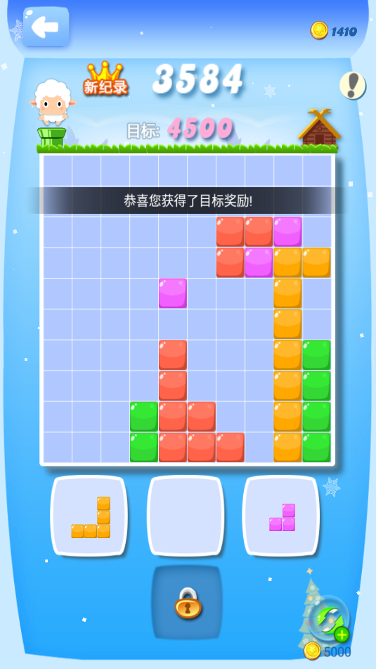 2、游戏中,点击下方的三个方块,可自由放置在上方的格子内,拼合满一行或一列即可消除获得分数。