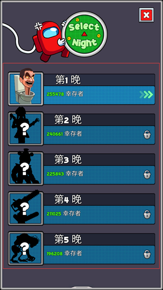 1、在夜晚选择界面,看到已解锁的第1晚,对应29599幸存者数量,点击进入该夜晚的生存挑战环节。