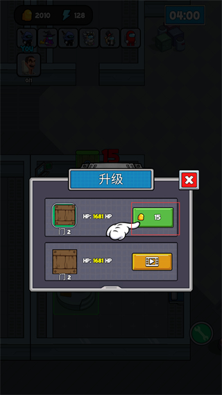 2、进入升级界面,选择对应道具,点击黄色升级按钮,消耗资源提升道具的HP属性,增强防御能力。