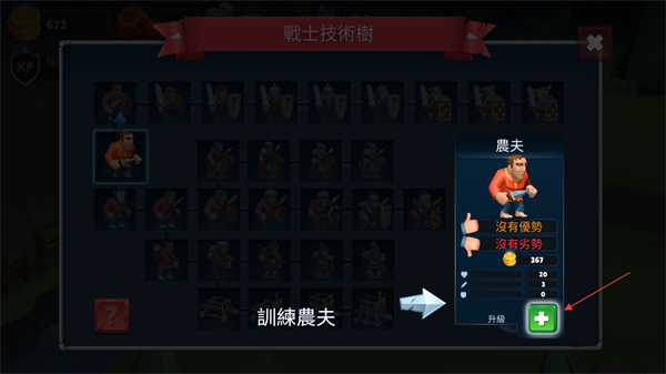 1、在战士技术树界面,找到对应农夫的选项,查看其属性信息,点击升级按钮,消耗对应资源训练农夫,解锁该单位用于后续战斗。