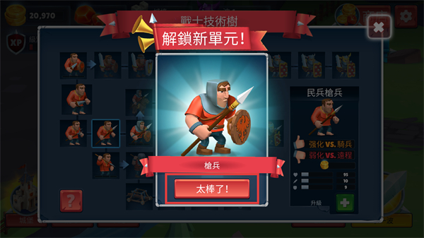 2、界面弹出解锁新单位枪兵的提示窗口,查看枪兵的属性特点,点击太棒了按钮确认解锁,获取这个新作战单位来丰富己方兵力配置。
