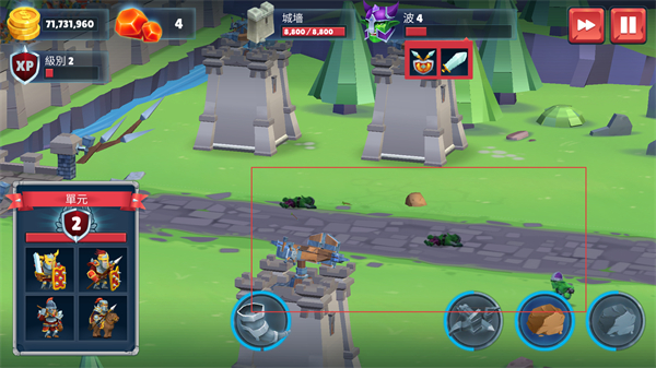 3、进入战斗场景后,查看左侧的己方作战单位,选择合适的单位布置到战场区域,配合塔楼等防御设施,抵御敌方单位的进攻行动。