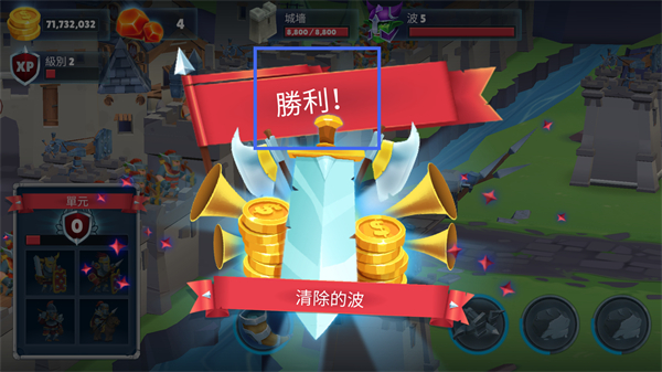 4、完成当前波次的防御战斗后,界面显示胜利提示与金币奖励,确认战斗结果后,点击清除该波按钮,结束当前战斗波次准备应对下一轮。