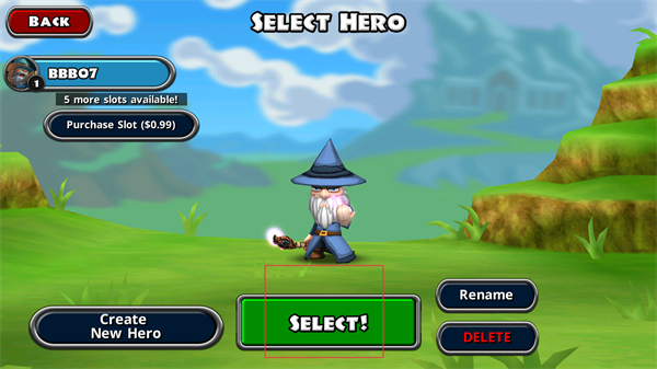 3、在英雄选择界面点击SELECT按钮,选定巫师形象的英雄,进入后续的地下城探索环节。