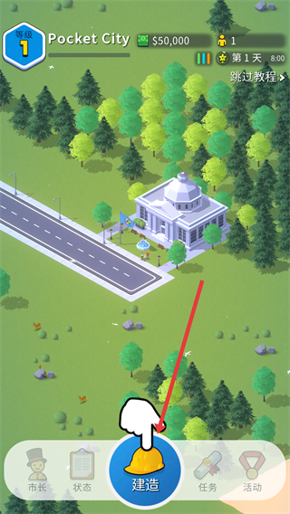 1、点击界面底部的建造按钮,调出城市建设相关的功能选项,准备开始规划城市的基础配套设施。
