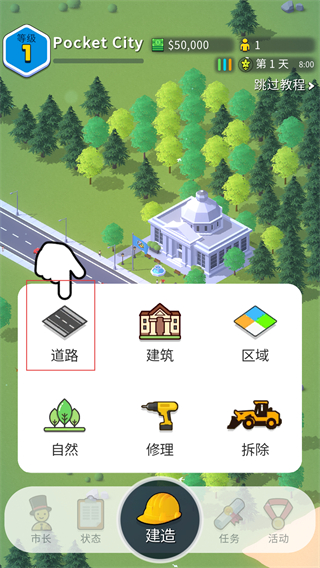 2、在建造功能栏中选择道路选项,进入道路规划的操作界面,为后续城市交通网络搭建做准备。