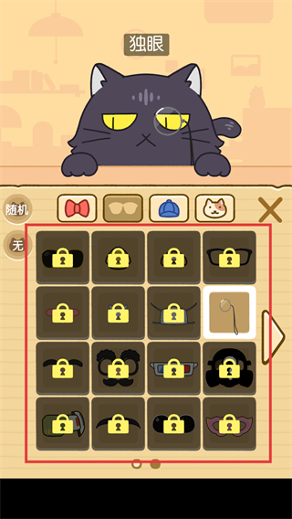 4、进入装扮界面,选择独眼道具并应用到黑猫身上,改变其外观特征,完成本次装扮设置。