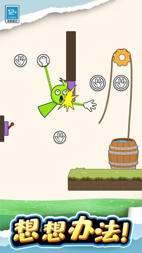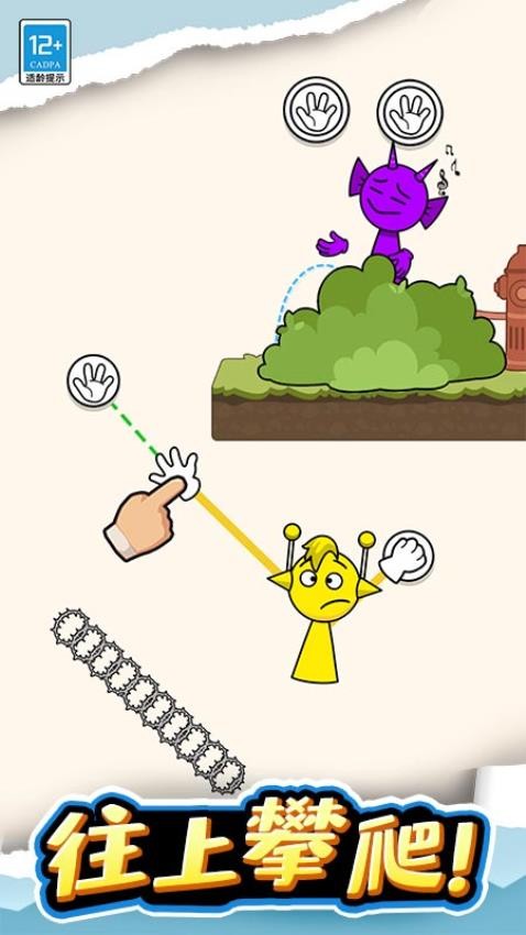 1、点击拖拽小怪手臂自由拉伸、摆动,与场景物体互动抓住支点,跨越障碍收集道具。