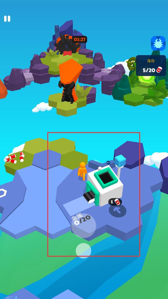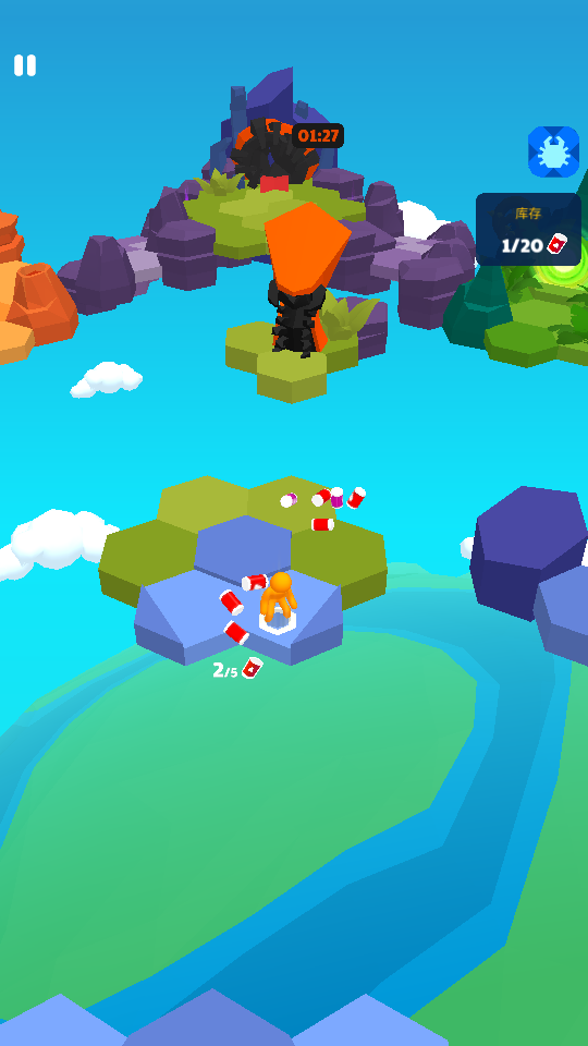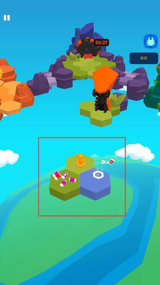 1、进入游戏,操控角色在异星场景的六边形地块上活动,收集散落在地块上的道具,为后续行动做准备。