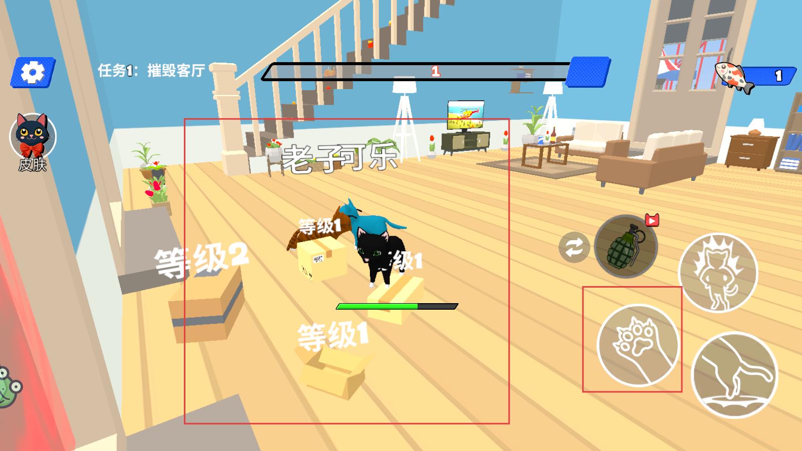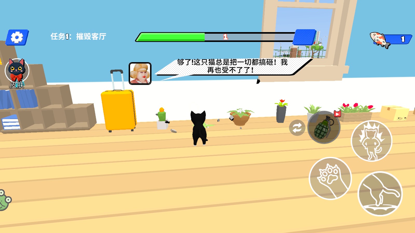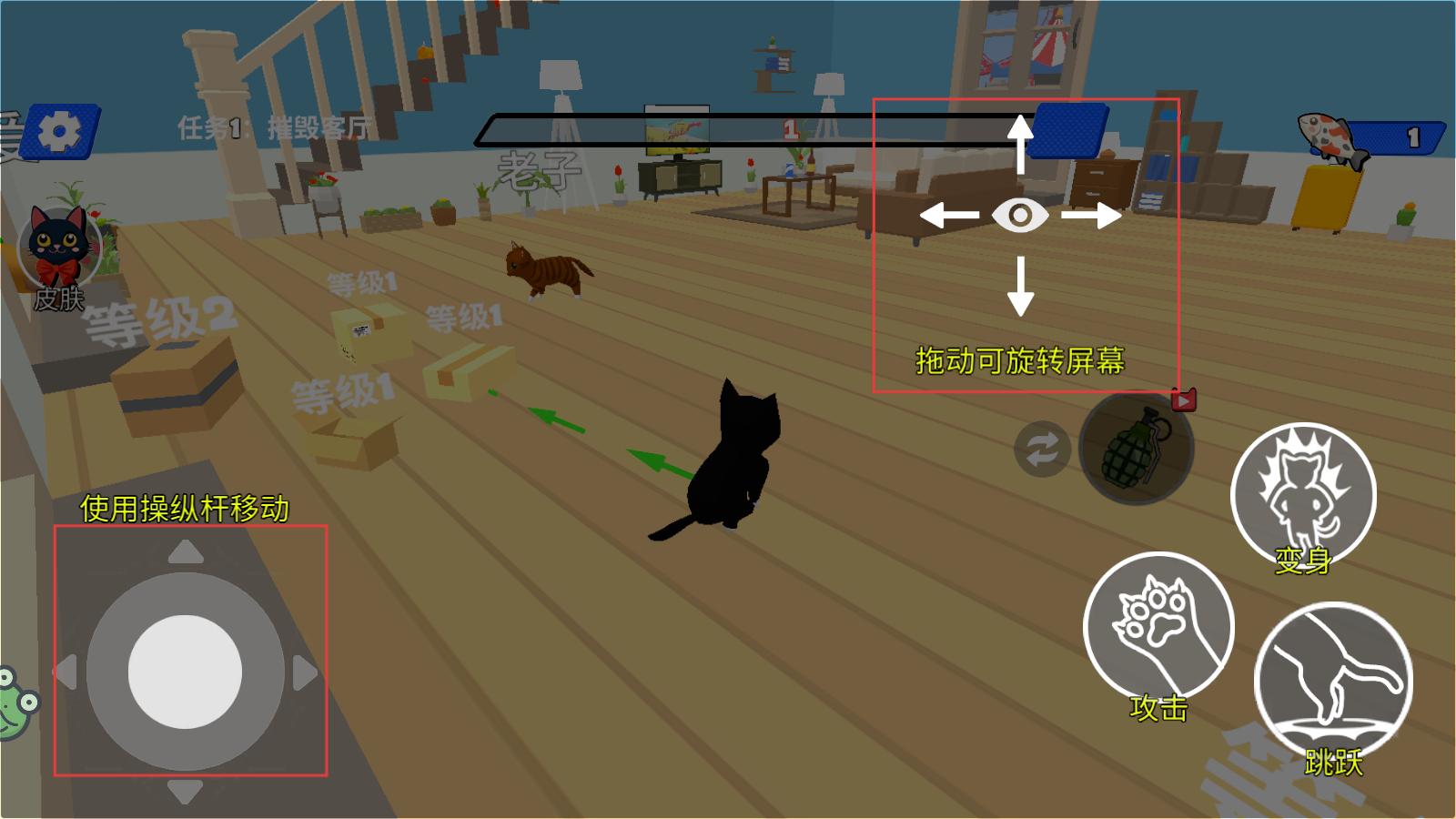 1、基础操作教学:通过虚拟摇杆控制移动,点击物品触发互动,长按可蓄力跳跃。新手引导阶段会逐步教授推倒、抓挠等核心动作的使用时机与效果差异。
