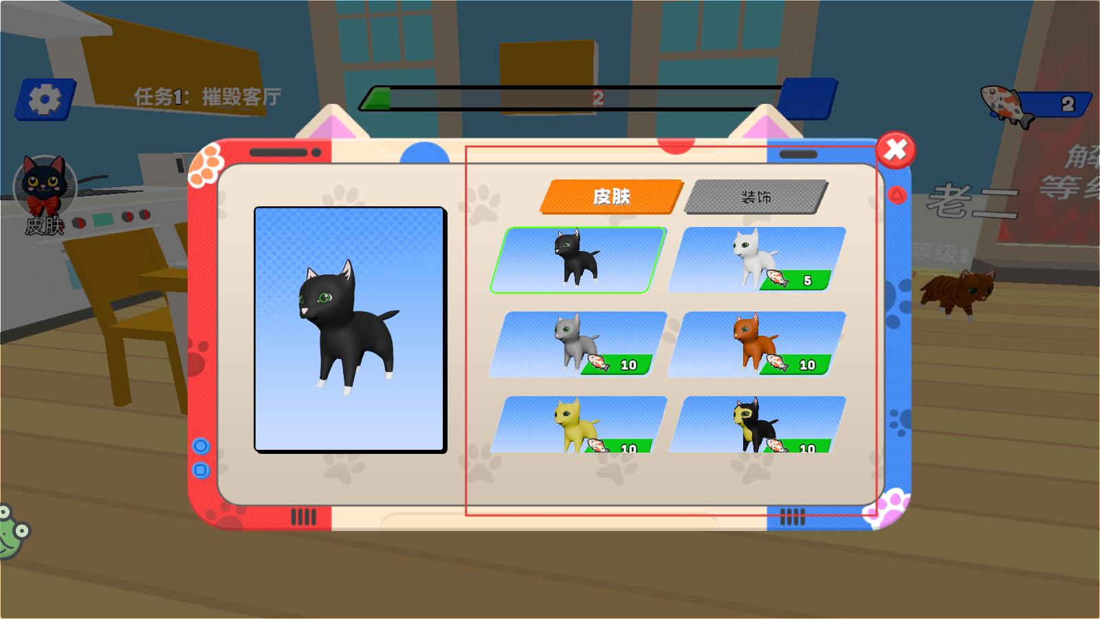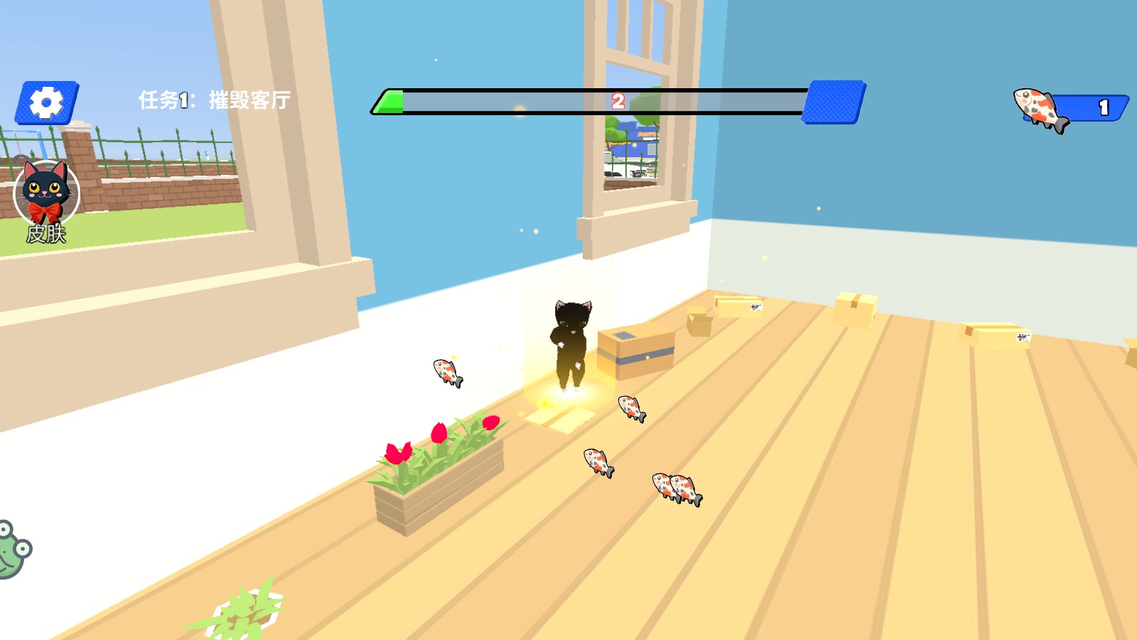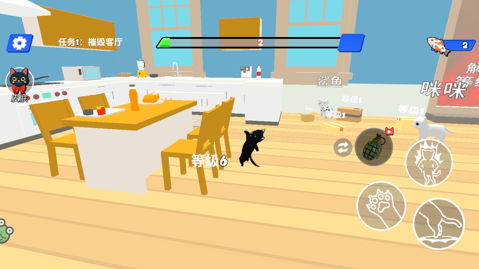 2、破坏方式组合:支持推动、抓挠、撞击等多种互动方式,高级关卡需要组合使用不同手法,例如先跳上餐桌再拍落餐具制造连锁反应达成复杂目标。