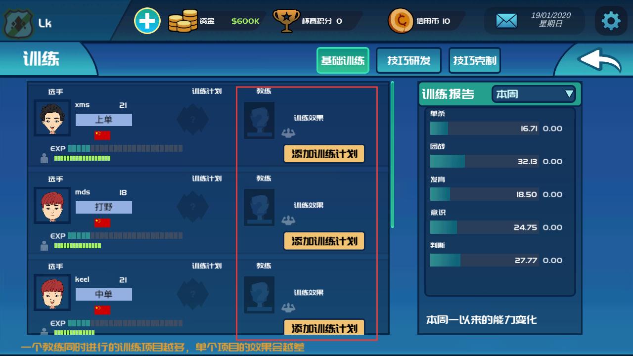 3、进入训练界面,为选手添加训练计划,提升他们的各项能力,助力战队实力增长。