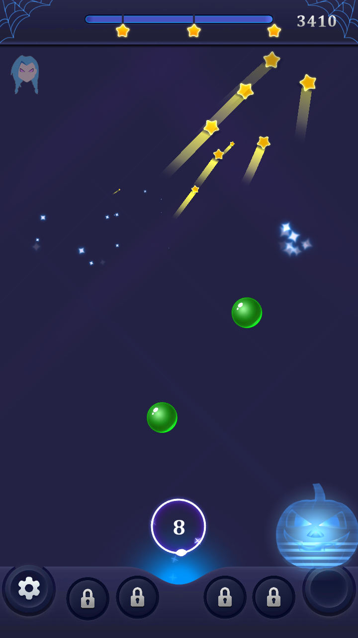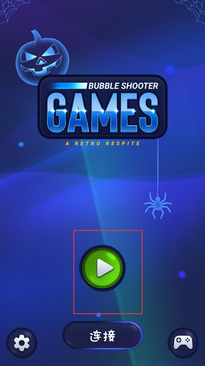1、进入游戏,看到带有南瓜、蜘蛛元素的界面,点击绿色三角形按钮,开启泡泡射击的休闲挑战。