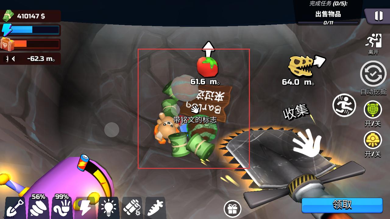 1、在地下挖掘时会遇到带铭文的标志等物品,点击收集按钮获取,这些物品可用于出售或解锁新内容,助力深入探索地下世界。