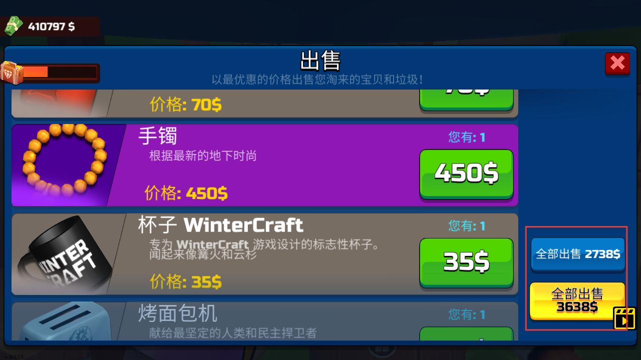 4、进入出售界面,可将手镯、杯子等物品出售,点击全部出售按钮能快速获取金钱,为升级挖掘设备提供资金支持。
