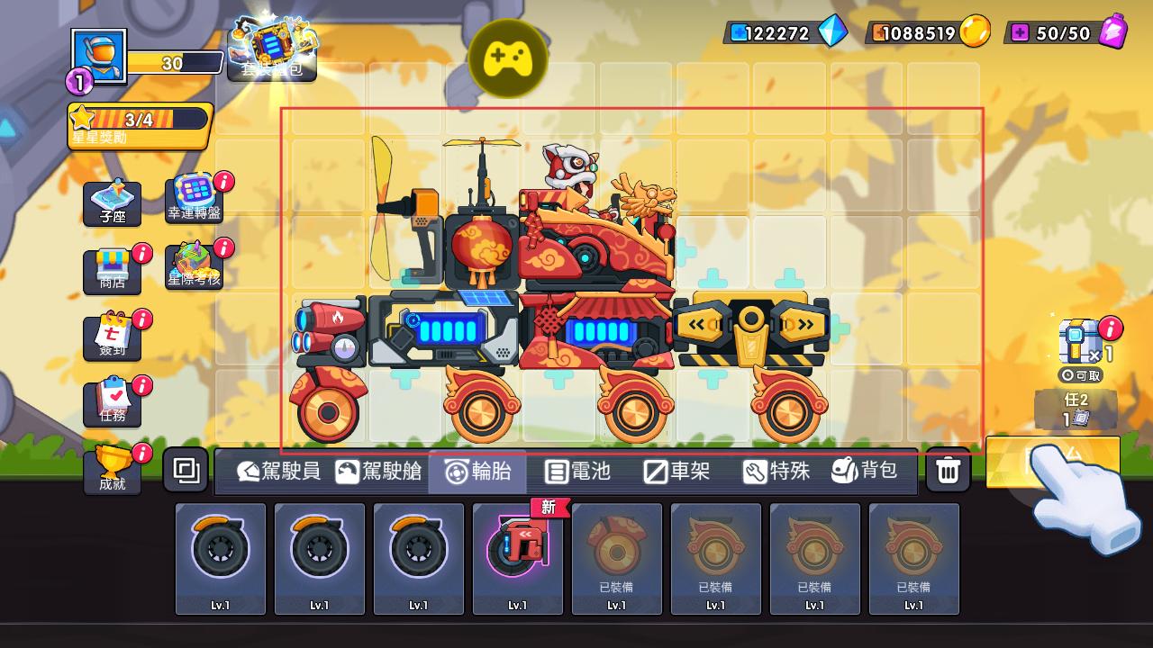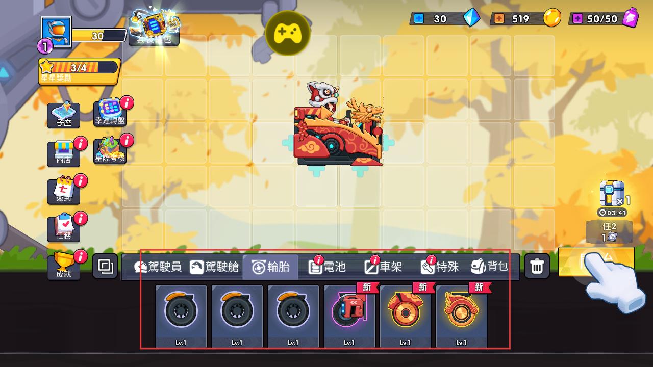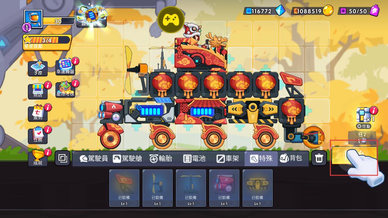 3、在特殊部件栏添加装饰或特殊效果部件,组装完成后点击按钮,开启山地赛道的驾驶挑战,体验越野竞速的乐趣。