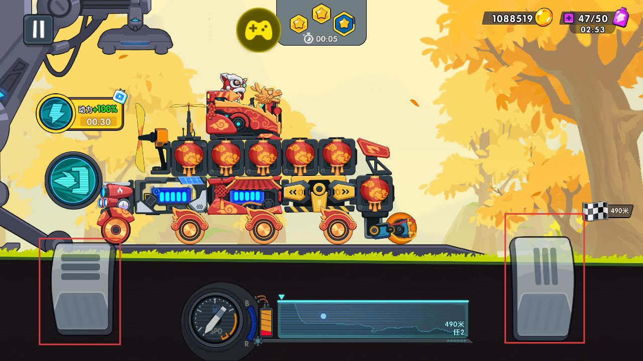 4、驾驶时用左右踏板控制前进后退,结合动力加成道具,根据山地地形调整操作,感受真实物理反馈,挑战更远赛道距离。