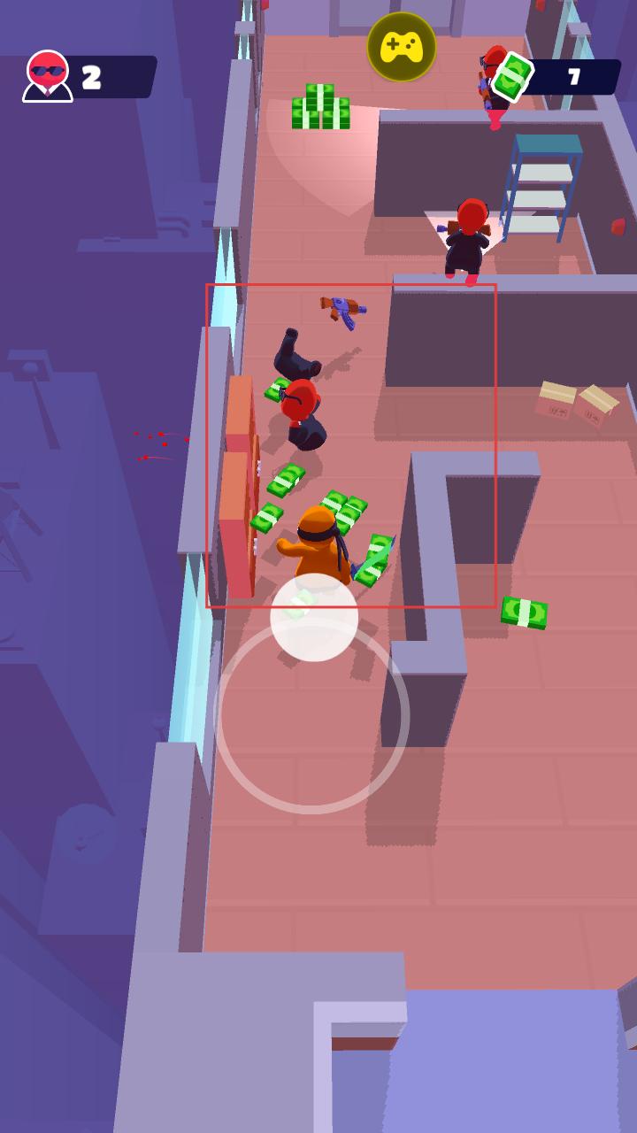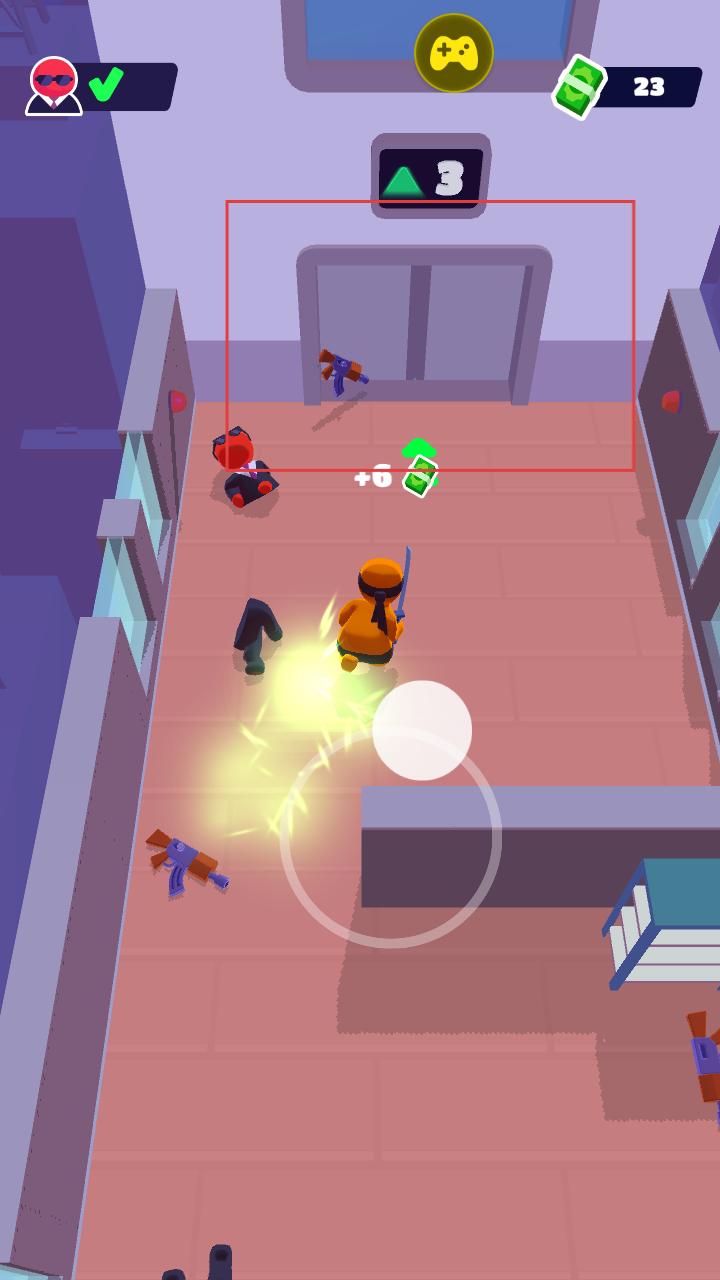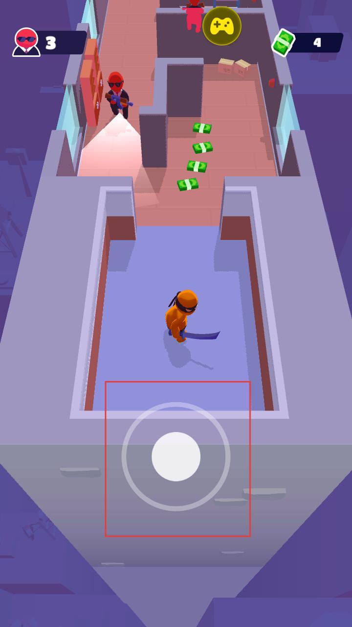 1、拖动移动按钮,操控橙色火柴人在场景里潜行,借助建筑物藏好身形,留意敌人的巡逻路线和视野范围,为刺杀做准备。
