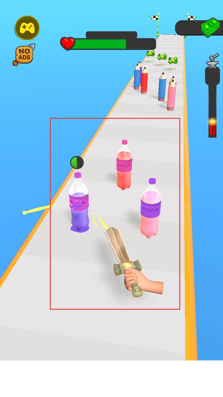 1、操控手持武器的角色在跑道上前进,用剑砍击紫色、红色、粉色汽水等障碍物,同时注意武器耐久,开启跑酷与锻造的冒险。