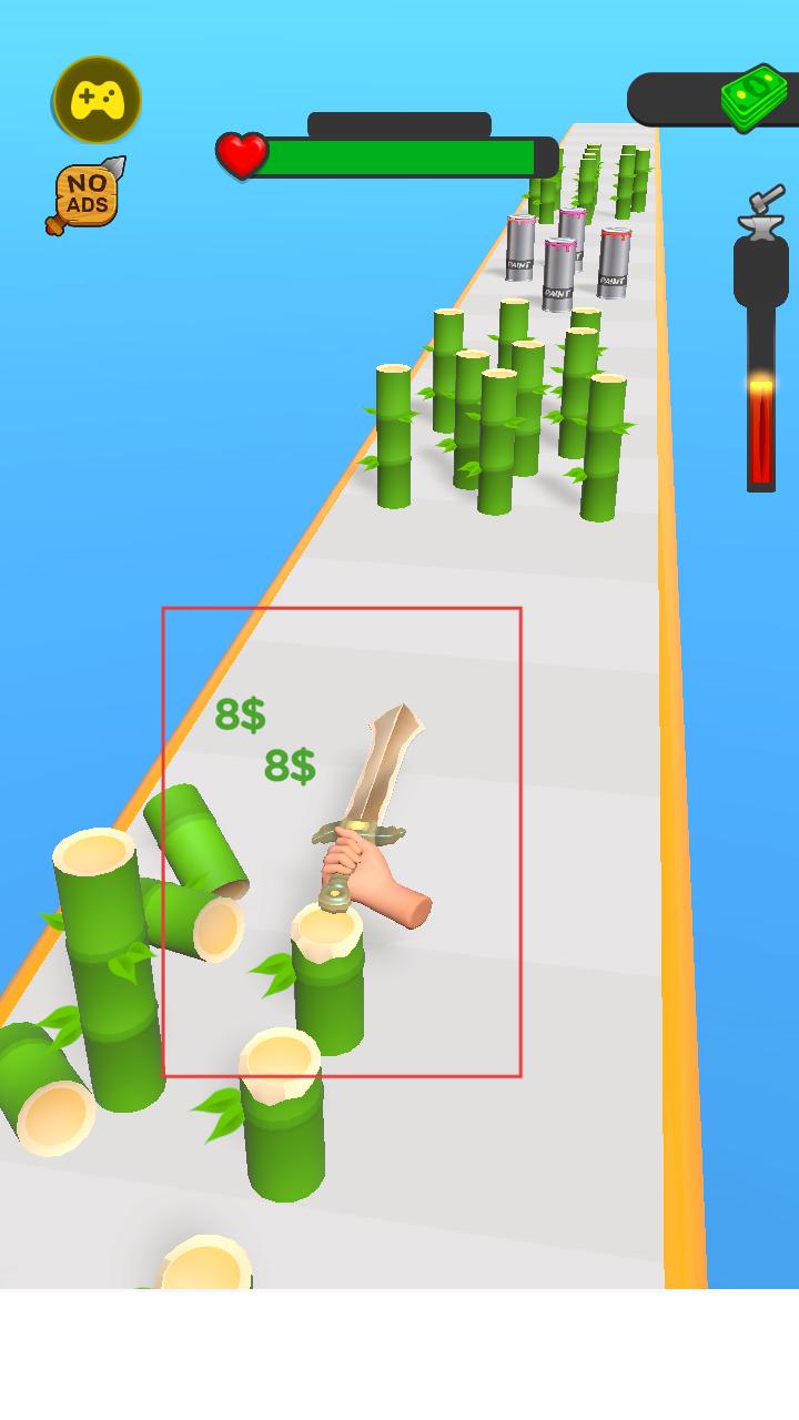 4、在跑酷跑道上用武器砍击绿色竹子,收集金币,这些金币可用于购买锻造材料或升级武器属性,推动武器锻造进程。