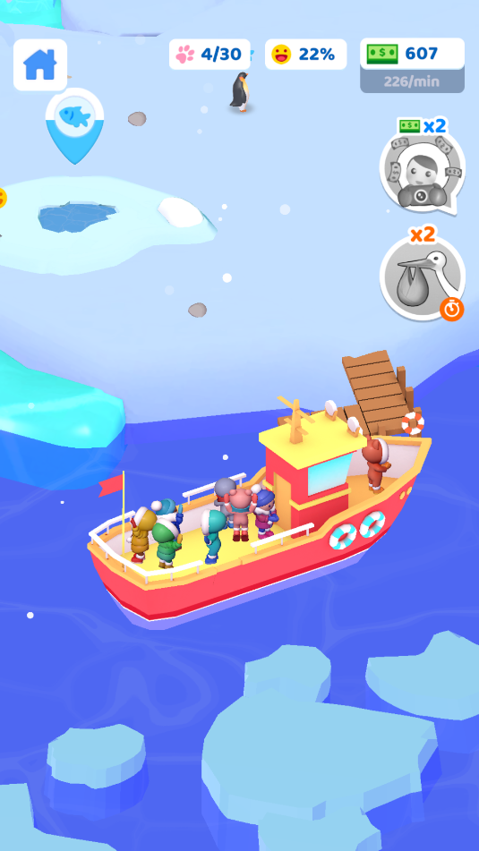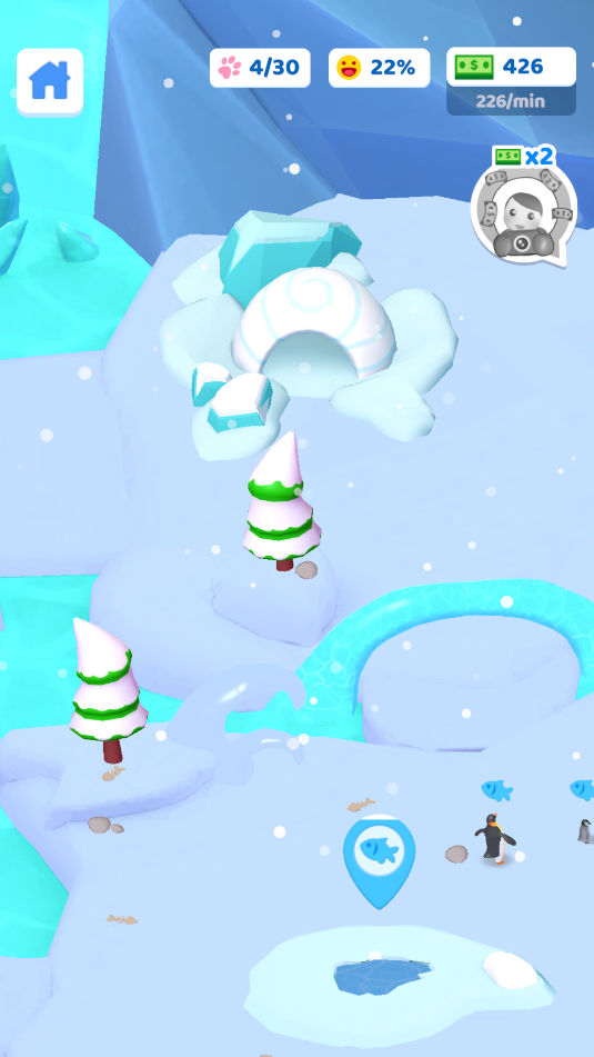 2、游戏里,企鹅会来抓鱼吃,点击这里的池塘进入升级。