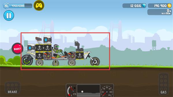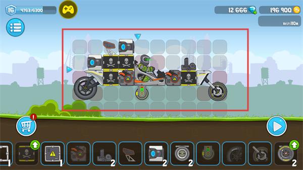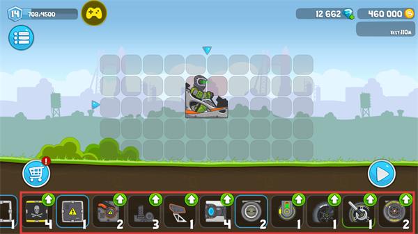 2、在组装界面选择引擎、车轮等零件,自由搭配组合,凭借千万种组合方案,构建契合自身策略的赛车,开启横版竞速挑战。