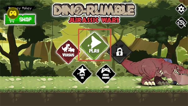 1、进入游戏主界面,点击绿色PLAY按钮,开启史前生物对抗的横版动作之旅,可从霸王龙、迅猛龙等特色恐龙中选择操控,参与侏罗纪战争。