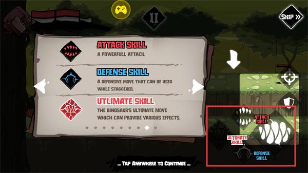 4、恐龙拥有攻击技能、防御技能与终极技能,右侧界面设有对应技能按钮,可释放强力攻击、防御招式与终极必杀,不同恐龙的天赋技能树带来差异化成长与战斗体验。
