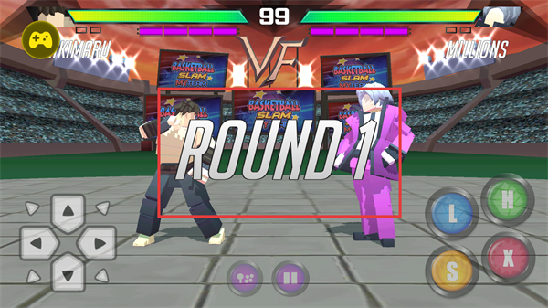 4、进入ROUND1格斗环节,操控角色利用虚拟按键释放技能,与对手展开格斗对决,争取获得胜利。
