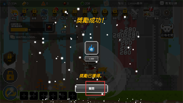 1、获得奖励后点击关闭按钮,可继续游戏,不断积累资源,助力剑士在奇幻世界中成长,开启更多冒险与养成内容。