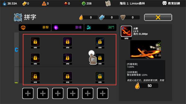 3、进入拼字界面,可解锁火葬等不同技能,每种技能有独特效果,如伤害增幅等,合理搭配技能提升战力,应对更强敌人。