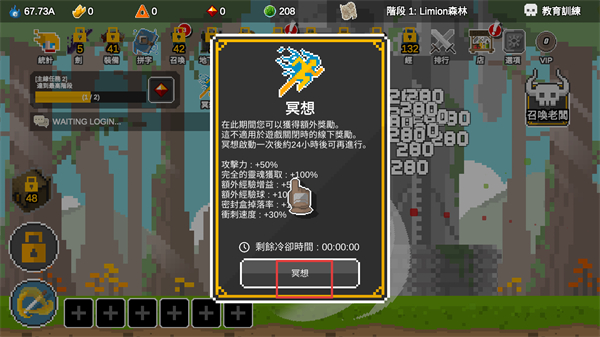 4、使用冥想功能,点击冥想按钮,可获得攻击、金币等增益,冥想冷却24小时后可再次使用,助力剑士持续成长。