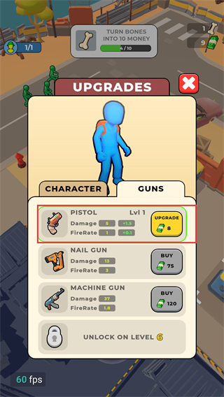 1、在升级界面可升级Pistol等枪械,提升伤害和射速,也可解锁Nail Gun、Machine Gun等武器,强化战力,为末日生存射击做好准备。