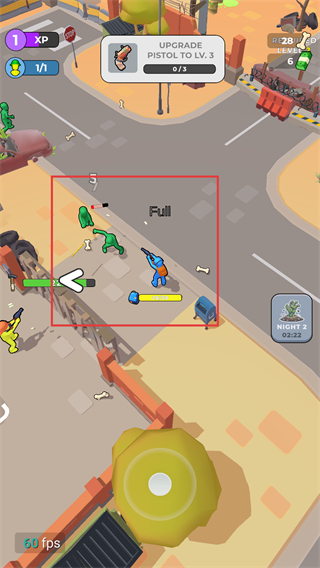 4、升级Pistol到更高等级,战斗时收集骨头等资源,同时攻击僵尸,在废弃城市中探索收集物资,提升末日生存能力。