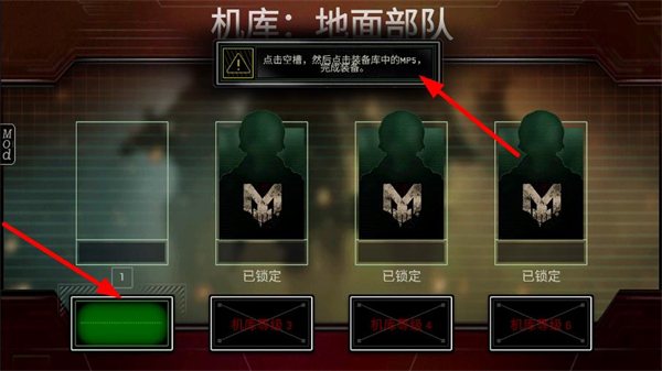 2、进入机库地面部队界面,点击空槽后点击装备库里的MP5,按提示完成装备,逐步进行部队装备配置。