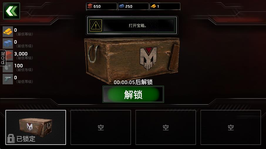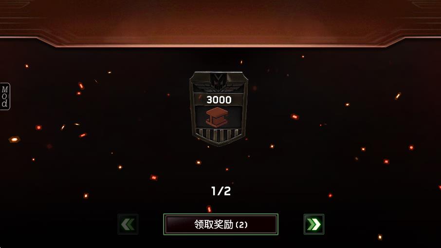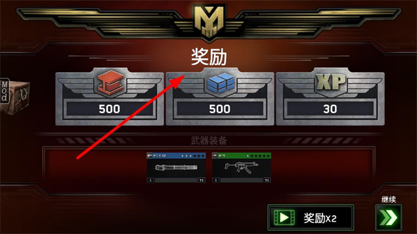 4、完成操作后进入奖励界面,可获得500红色资源、500蓝色资源和30XP,还有武器装备奖励,助力后续游戏进程。