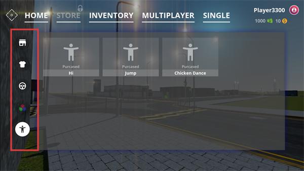 1、在游戏界面左侧可选择商店、服装、车辆等菜单选项,通过这些选项定制角色、获取载具等,开启城市沙盒的建造与探索之旅。